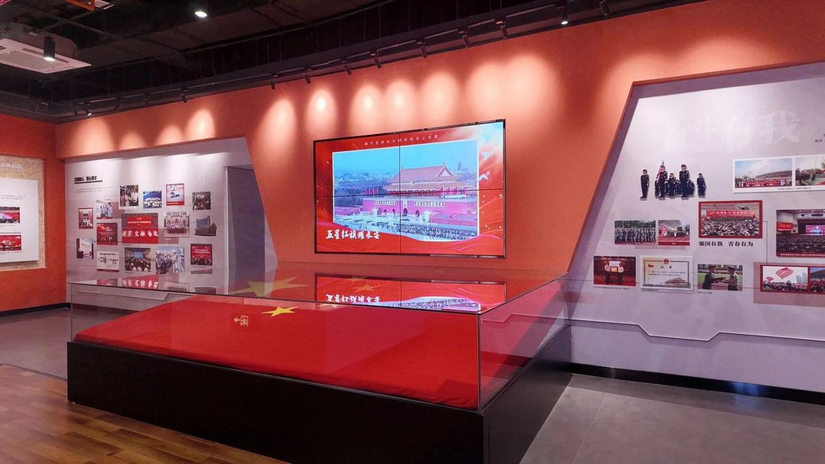 增设爱国主义教育专题展区,展示了2021年4月18日校庆70周年当天在天安门广场升挂的国旗,同步迭代组织建设、人才培养、师资团队、校园文化等板块内容。